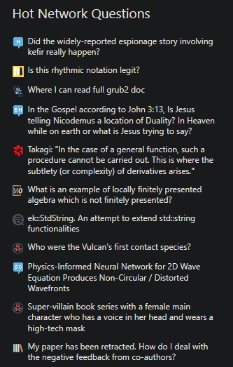 One of my new year’s resolutions is to block even more useless/annoying sites at the hosts level. One particular site already makes my skin crawl with all of their haughty users “answering” questions by openly insulting people/rejecting the question outright/answering completely incorrectly (this is nothing new, I think it was the CEO who acknowledged some of this years ago) ... there’s this jackass sidebar of unrelated slop for every post. This was half of the garbage on a test query “duh global variables function python duh.” B L O C K E D