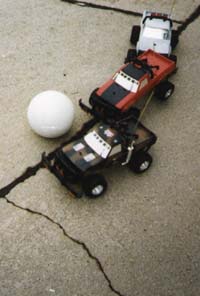 SEPTEMBER 28 1997 September was Truck Soccer's "growth" month. Learning to drive, learning to score, making up rules, getting rid of rules (like the retarded "holding your remote up so we know you're ready" rule). Team A: 10 -- Rock, The Bug, Army Team B: 7 -- Blackhole, Pokey Three man ball sweep! If you look closely, you'll notice that Rock is picking up The Bug's rear wheels. Everyone's getting better at ball handling, enhancements or no. It's universally agreed that Blackhole is the game's MVP. The neighbor kid comes over. He's been watching the games, and he went and bought a smaller Jeep. It's the same one that C.H. bought at the start of Truck Soccer, but then was returned because the larger Scorpion II trucks just roll all the hell over it. It also has a frequency bleed problem with The Rock, so there's no way of incorporating it into the game. The soccer ball is thrown in the air on the tip-off (the snap? the what?) to prevent goal rushes. It is quickly abandoned. |