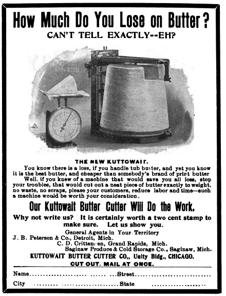 Advertisement, Kuttowait Butter Cutter Company, Trade, Detroit (1906). “How much do you lose on butter? Can’t tell exactly ‒ eh?”