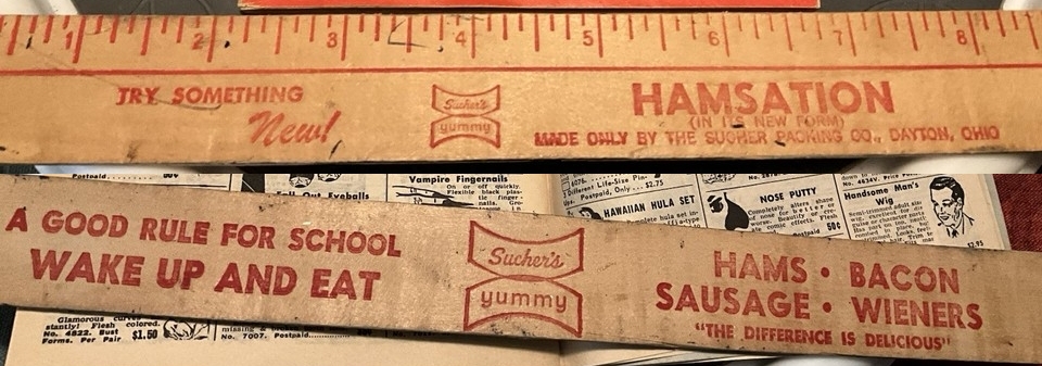 Promotional ruler, Sucher Packing Company, Dayton Ohio. “TRY SOMETHING NEW!” “HAMSATION (IN ITS NEW FORM)” “A GOOD RULE FOR SCHOOL ‒ WAKE UP AND EAT Sucher’s yummy HAMS ‒ BACON ‒ SAUSAGE ‒ WIENERS” “THE DIFFERENCE IS DELICIOUS”