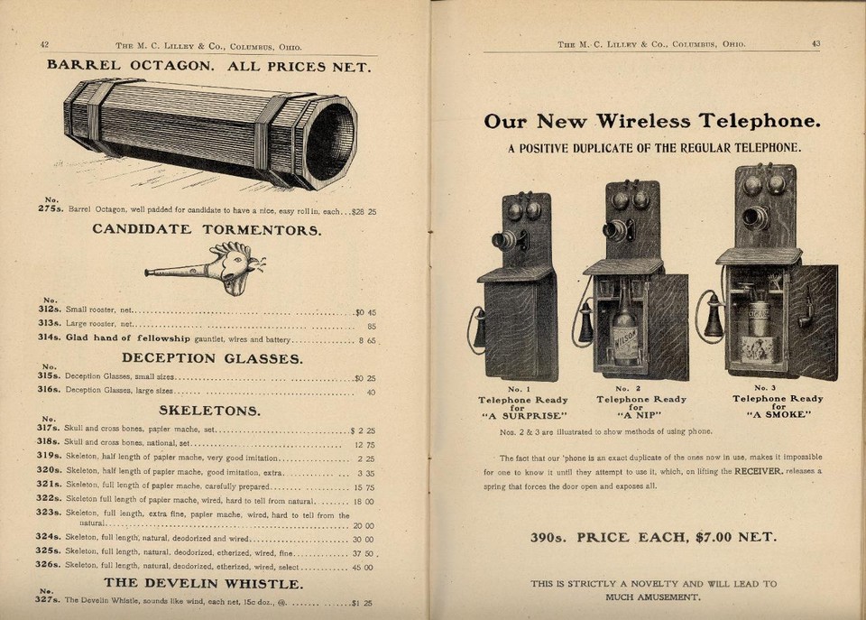 BARREL OCTAGON (“well padded for candidate to have a nice, easy roll in”) CANDIDATE TORMENTORS ETC (“Glad hand of fellowship: gauntlet, wires and battery”); Our New Wireless Telephone A POSITIVE DUPLICATE OF THE REGULAR TELEPHONE (“on lifting the RECEIVER, releases a spring that forces the door open and exposes all” [alcohol or tobacco products which is sort of the opposite of a hazing and confuses the candidate but mentally i guess])
