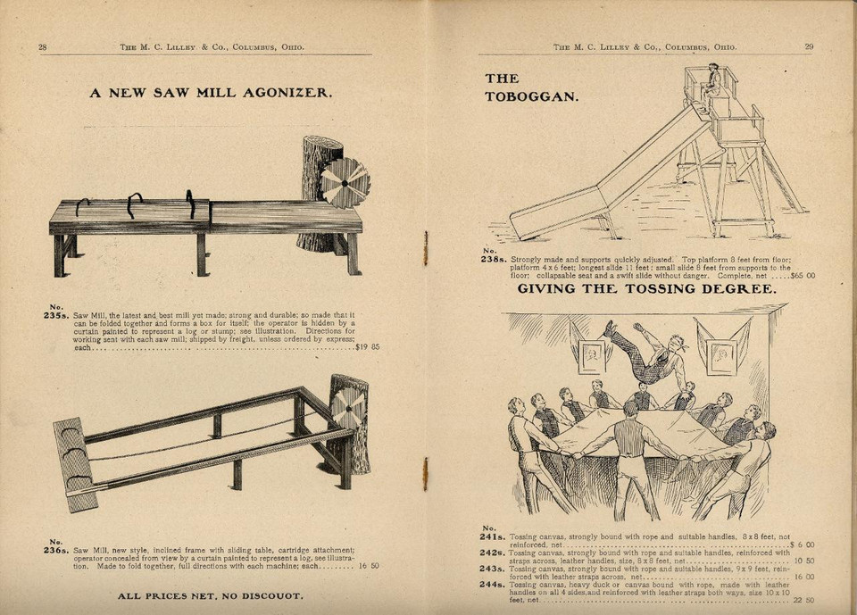 A NEW SAW MILL AGONIZER (“operator hidden by a curtain painted to represent a log or stump”), THE TOBOGGAN (collapsing chair on eight foot platform, featuring “swift slide without danger”), GIVING THE TOSSING DEGREE (various canvases used for tossing candidate)