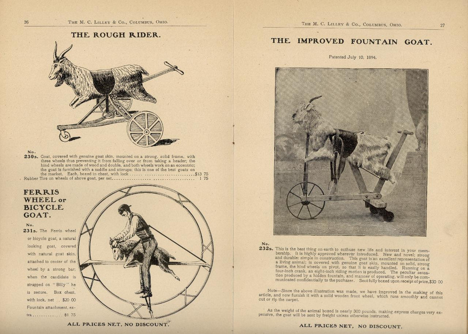 THE ROUGH RIDER (fake wheeled goat); FERRIS WHEEL OR BICYCLE GOAT (fake goat attached to large circular frame); THE IMPROVED FOUNTAIN GOAT (fake goat, wheels, push handle, hidden fountain, “Patented July 10, 1894,” “nearly 300 pounds”)