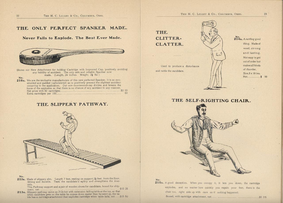 THE ONLY PERFECT SPANKER EVER MADE ‒ Never Fails to Explode; THE SLIPPERY PATHWAY (“Made of slippery elm,” includes exploding cartridge), THE CLITTER-CLATTER (“Used to produce a disturbance and rattle the candidate,” mysteriously does not contain exploding cartridge; THE SELF-RIGHTING CHAIR (trick + cartridge);