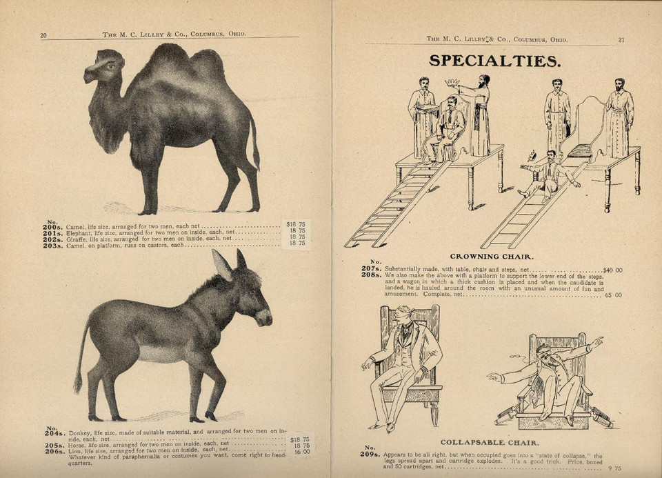 camel/donkey two-person costumes w/human shoes; Crowning Chair (candidate receives crown, immediately falls out of trick seat down trick stairs); Collapsible Chair (“the legs spread apart and cartridge explodes”)