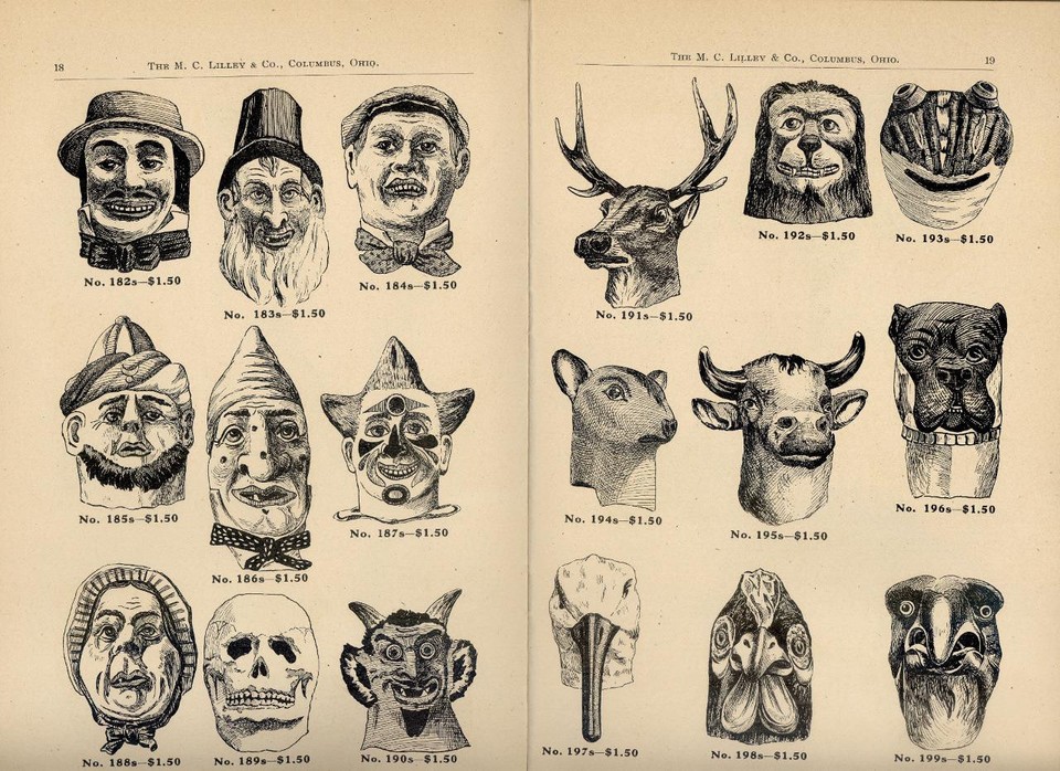 Selected pages of Catalog No. 134 of Specialties for Secret Societies / Burlesque and Side Degree Rituals / Costumes & Paraphernalia / Manufactured by The M. C. Lilley & Co. Columbus, Ohio.