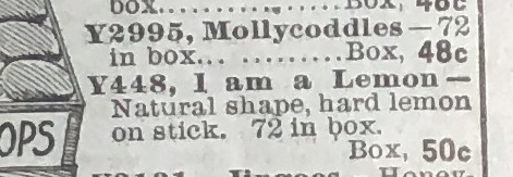 I am doing research on a candy bar from about 1927 for recreational reasons. I started down the path because of the name. It’s a ... strange name. Not the best name for a candy. The best name for a candy, which I’ve covered before (perhaps in upcoming materials, I can’t remember), is “I am a Lemon.” This is from a Butler Bros. 1910 catalog.