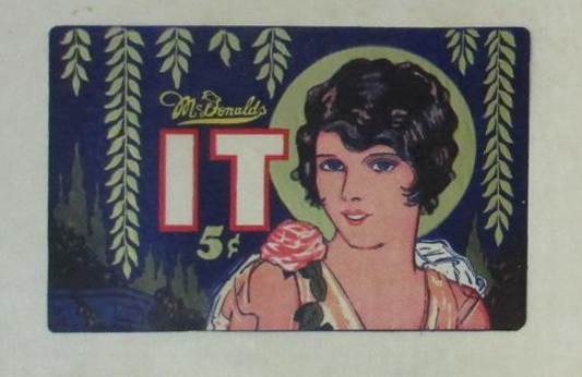 I have given up on finding any online information about the candy bar I was talking about earlier today. Here it is, trying to cash in on the 1927 movie It starring Clara Bow.