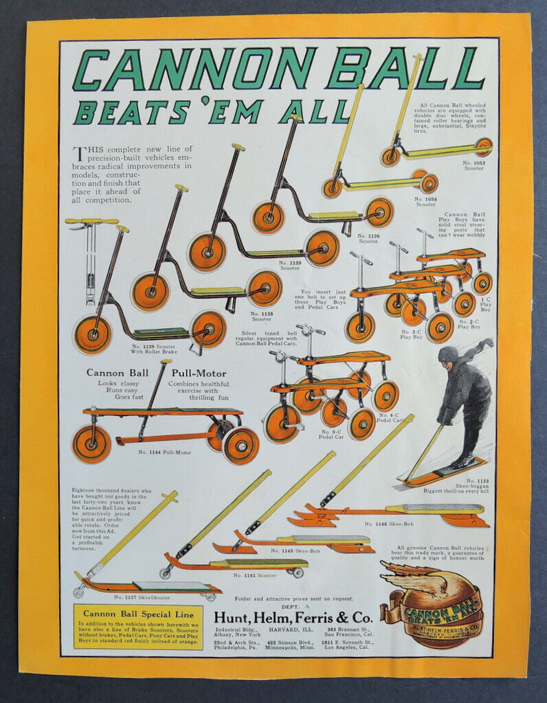 1926 advertisement for Cannon Ball scooters and variants from Hunt, Helm, Ferris & Co. These are my favorite type of ye olde ads ‒ show as much as you can. Wordy, chewy dense design. The 1926 Skee-boggan certainly feels like “prior art” to throw at the Snurfer. Same pad, same shape, just instead of a rope, a nice wooden pole that will really give you a poke when you wipe out halfway down the hill.