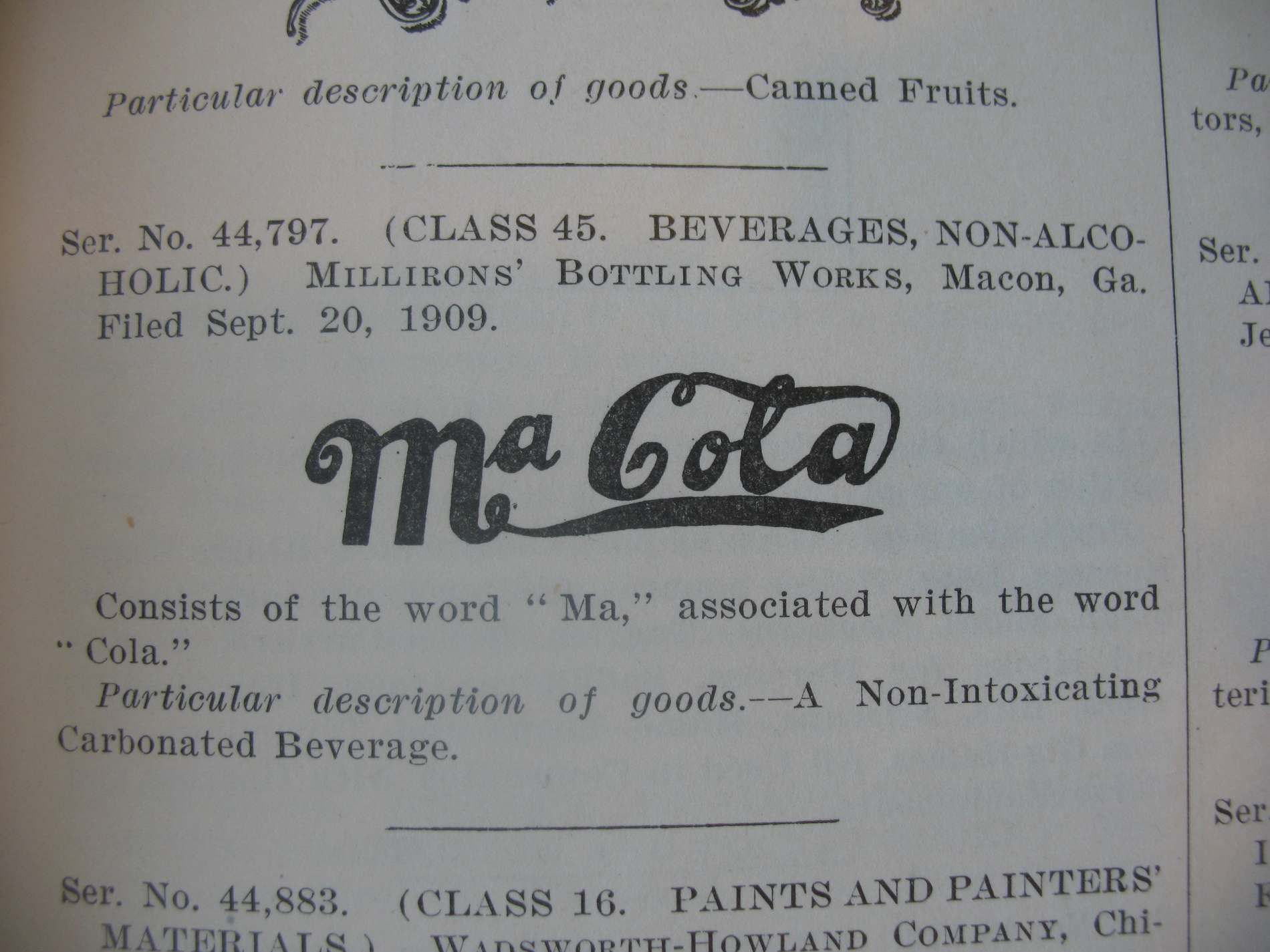 Ma Cola trademark registration. Filed September 20th, 1909.