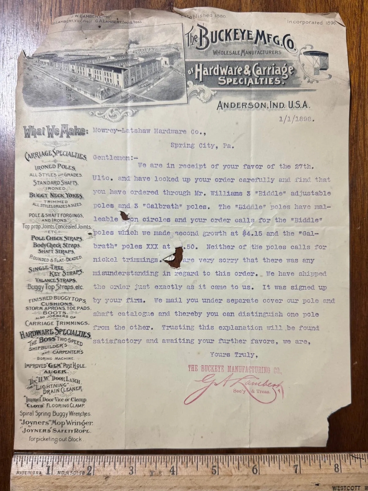 Buckeye Manufacturing Company, Hardware & Carriage Specialties, 1898 letterhead (auction).