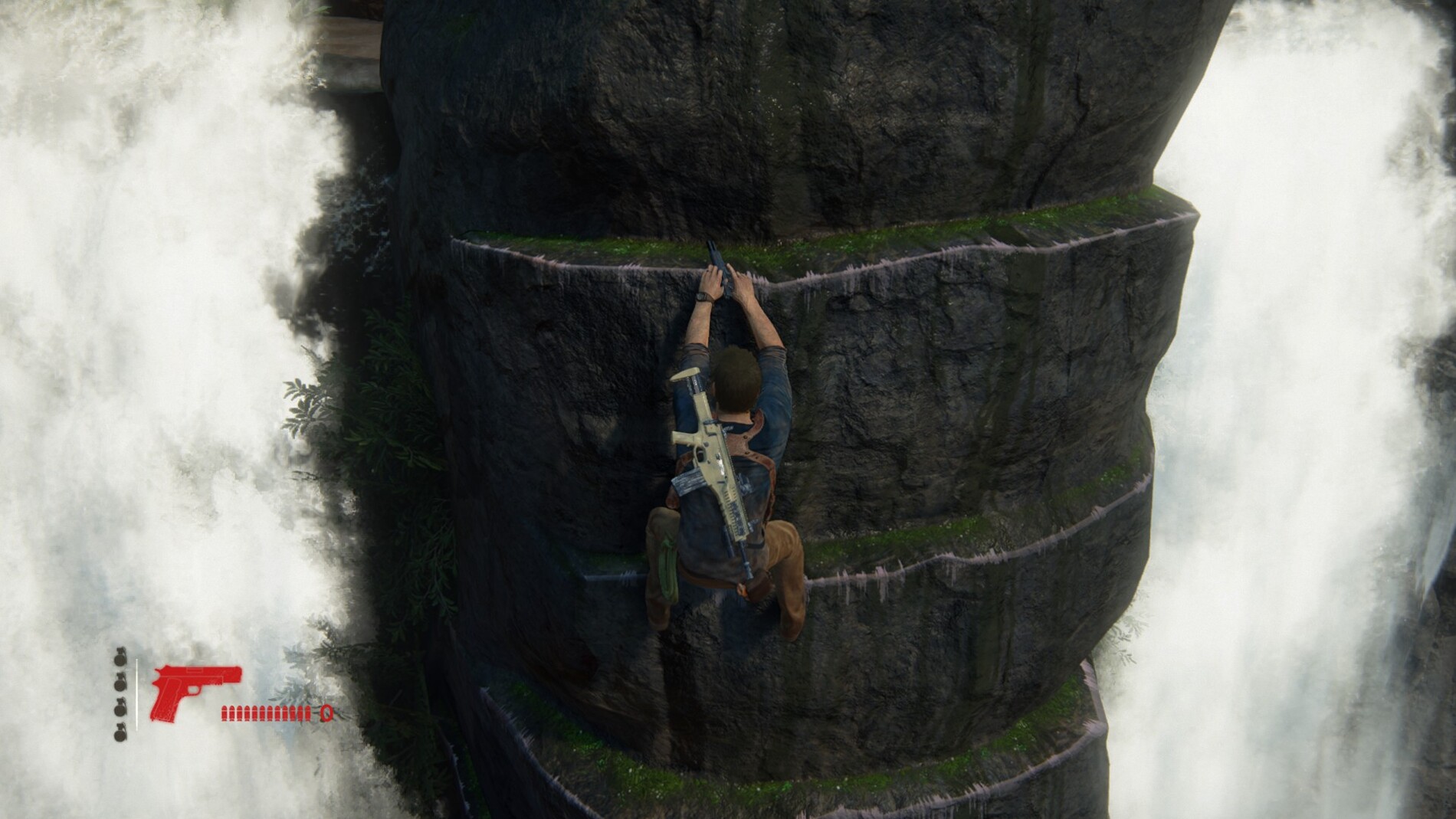 Below: Trapped on rock face, enemies in half-circle, shooting, sniping, dropping grenades every 30 seconds. Enemies chucking grenades in huge arcs, landing repeatedly in the same exact spot where you’re holding on to the ledge. Out of bullets. The game sets up these sort of scenarios with paltry looting. Really encouraging run-and-gun while Nate’s bullet allergy calls for a more “hole up and double down on strategy” angle. Sometimes you just have to let go of the ledge and start again.