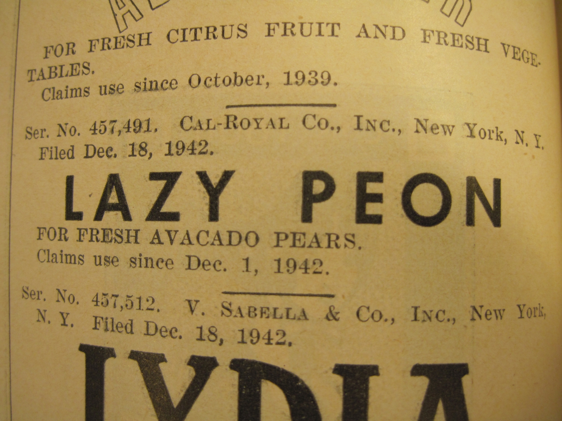 LAZY PEON fresh avocado pears trademark Cal-Royal Co., Inc., 1942.
